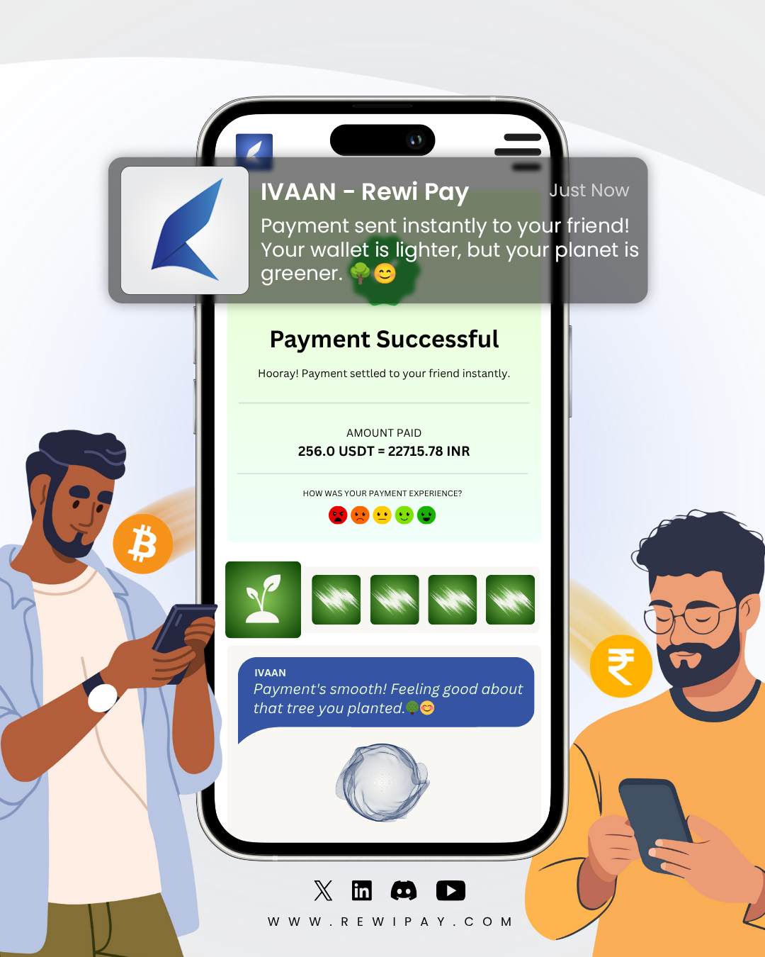 Each post blends illustrative elements with real UI components to show how RewiPay works in real life, from sending crypto payments to receiving INR seamlessly. Emphasis is placed on conveying trust, speed, and user empowerment core pillars of a fintech brand. The visuals also integrate subtle narrative moments, such as environmental rewards or emotional user interactions, making the experience feel more human and relatable.